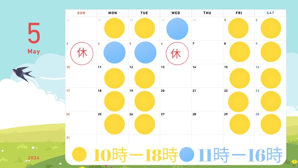 ご来店の際は営業日をご確認のうえ、お気をつけてお越しください。